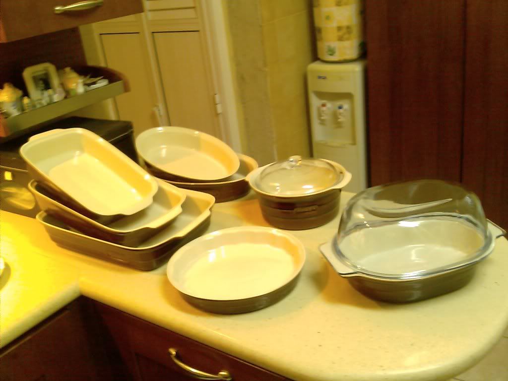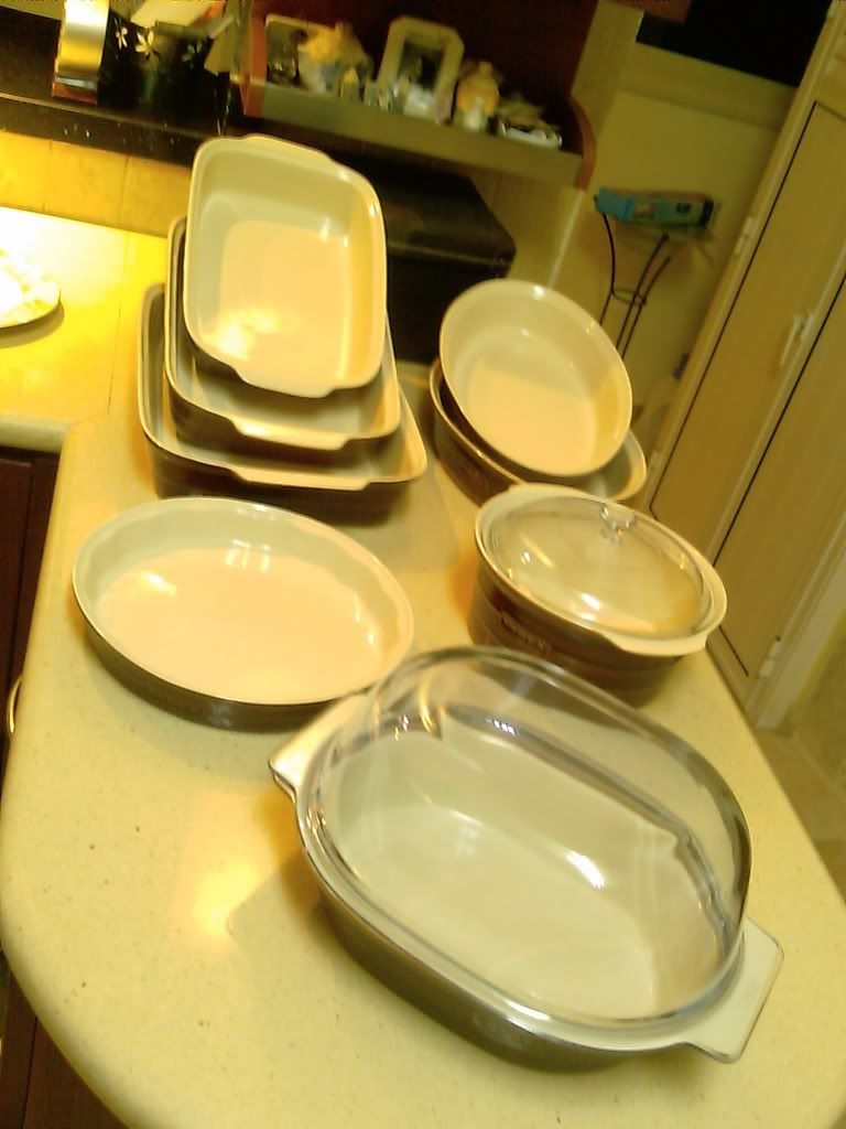 • Pyrex casseroles, brand new, 7 pieces brown colours 2 glass lids, euro 75.00 for the full set.